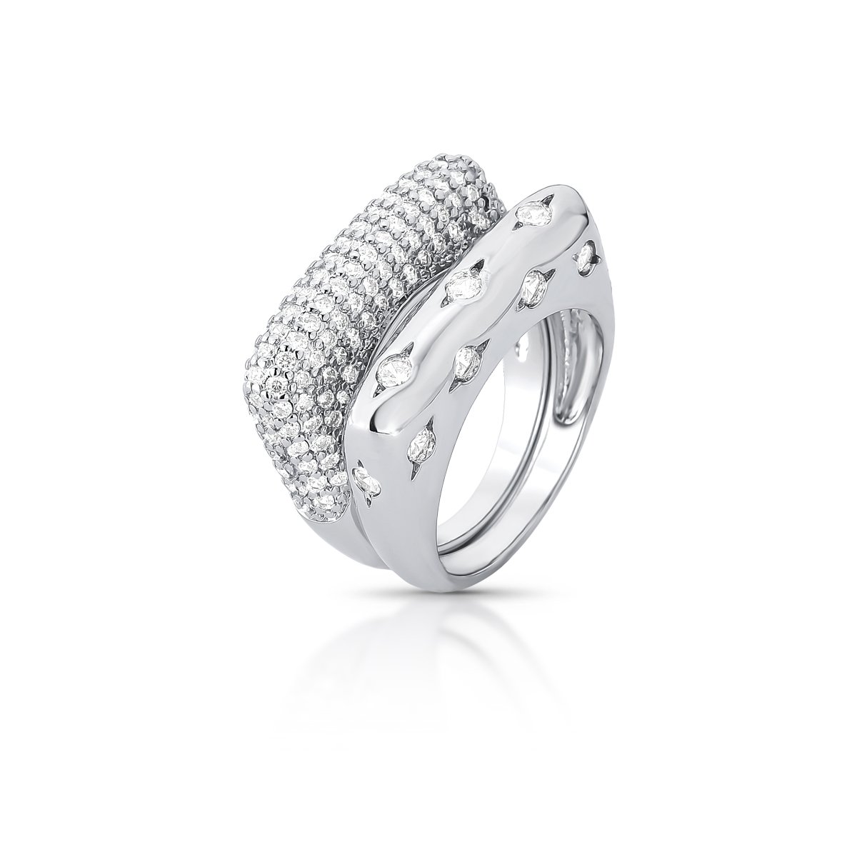 Este anel duplo com banho em ródio combina pedras cravejadas e zircônias em sete linhas, criando um brilho intenso e elegante. Seu design curvo com frente retangular valoriza a estrutura da peça e garante imponência sem perder a delicadeza.