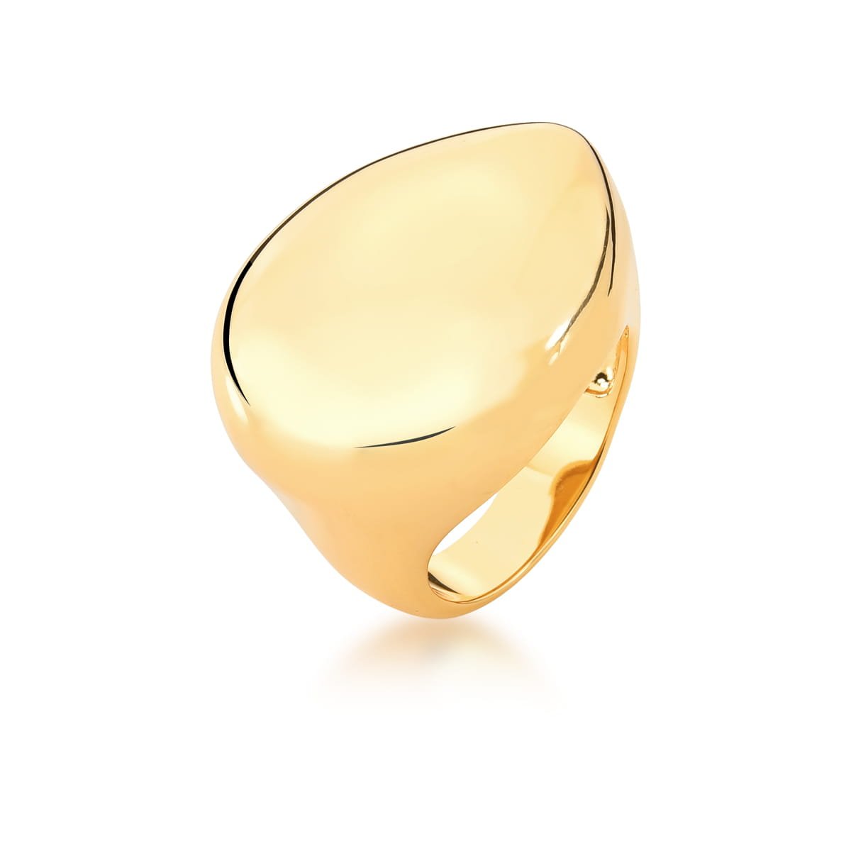 Este anel grande, com frente em gota abaulada e banho em ouro, é a tradução perfeita de imponência minimalista. Sua superfície lisa e brilhante reflete luz e atitude, transformando um design essencial em peça de destaque.