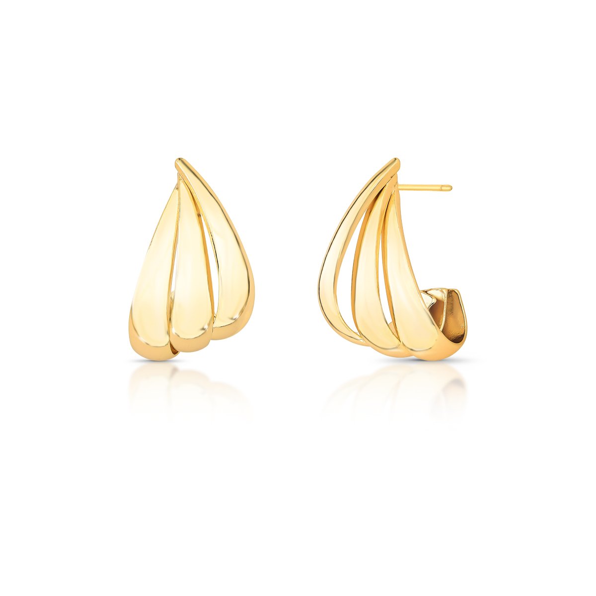 Este brinco meia argola em banho ouro traz três voltas lisas, curvas e vazadas, criando um efeito de leveza e fluidez. Seu design orgânico e moderno valoriza a elegância minimalista, transformando um clássico em uma peça cheia de personalidade.