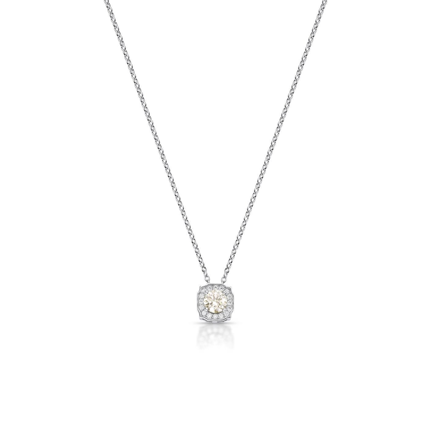 O colar apresenta um delicado pingente com pedra redonda de moissanite 5mm, lapidada para refletir brilho intenso e duradouro. O tom amarelo claro — tendência atual — acrescenta sofisticação e leveza ao design minimalista.