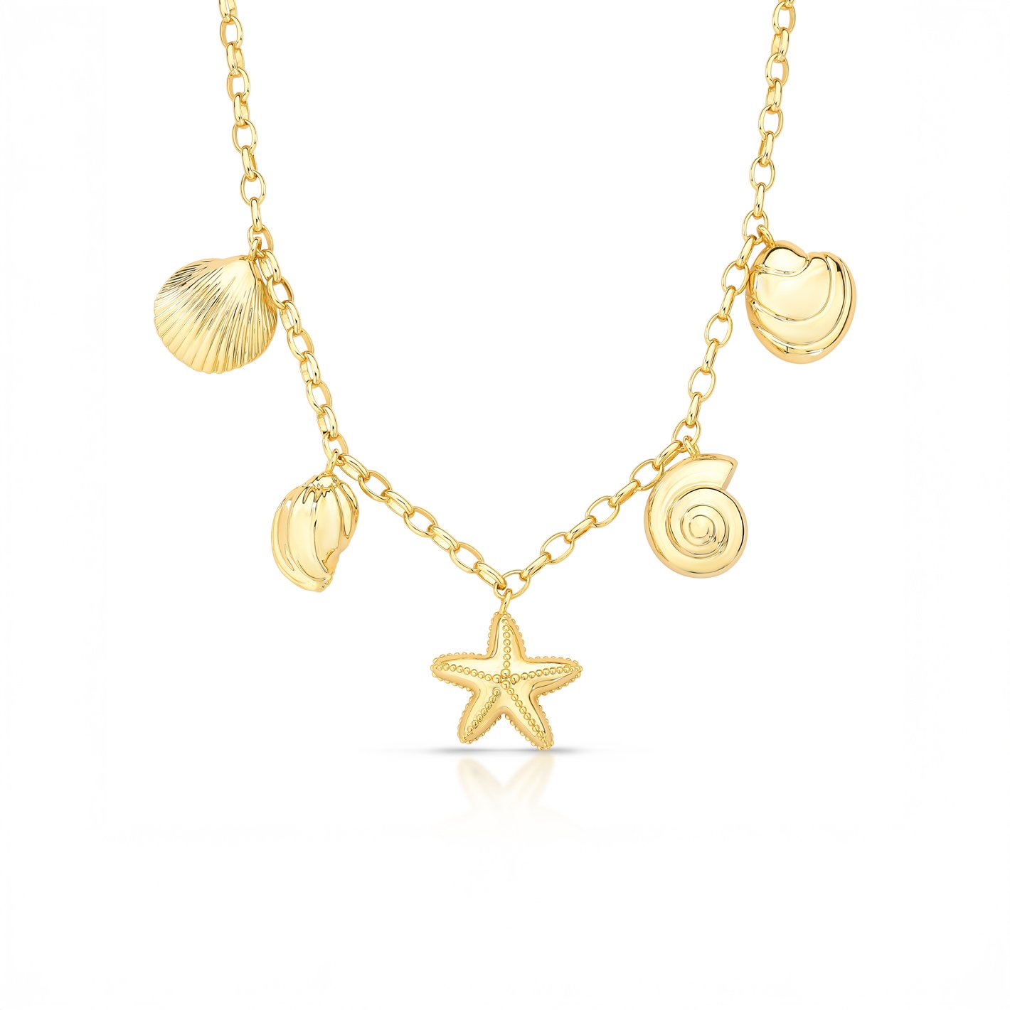 O colar com pingentes de conchas, estrela-do-mar e caracol no banho ouro é uma celebração à beleza natural do oceano. Cada elemento traz um símbolo único de conexão com a praia e sua energia leve, transformando a peça em um amuleto sofisticado e cheio de significado.