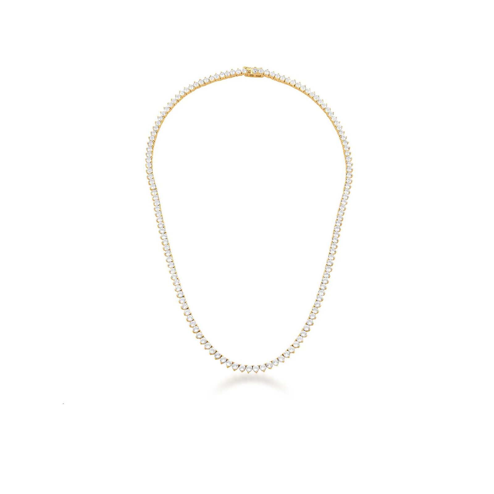 A corrente Riviera, com pedras redondas de 3 mm lapidadas e vazadas lateralmente, reflete luz em cada detalhe, criando um brilho sofisticado e contínuo. O banho em ouro valoriza sua presença atemporal, enquanto o tamanho de 40 cm a torna perfeita para ser usada sozinha ou em composições com outros colares.