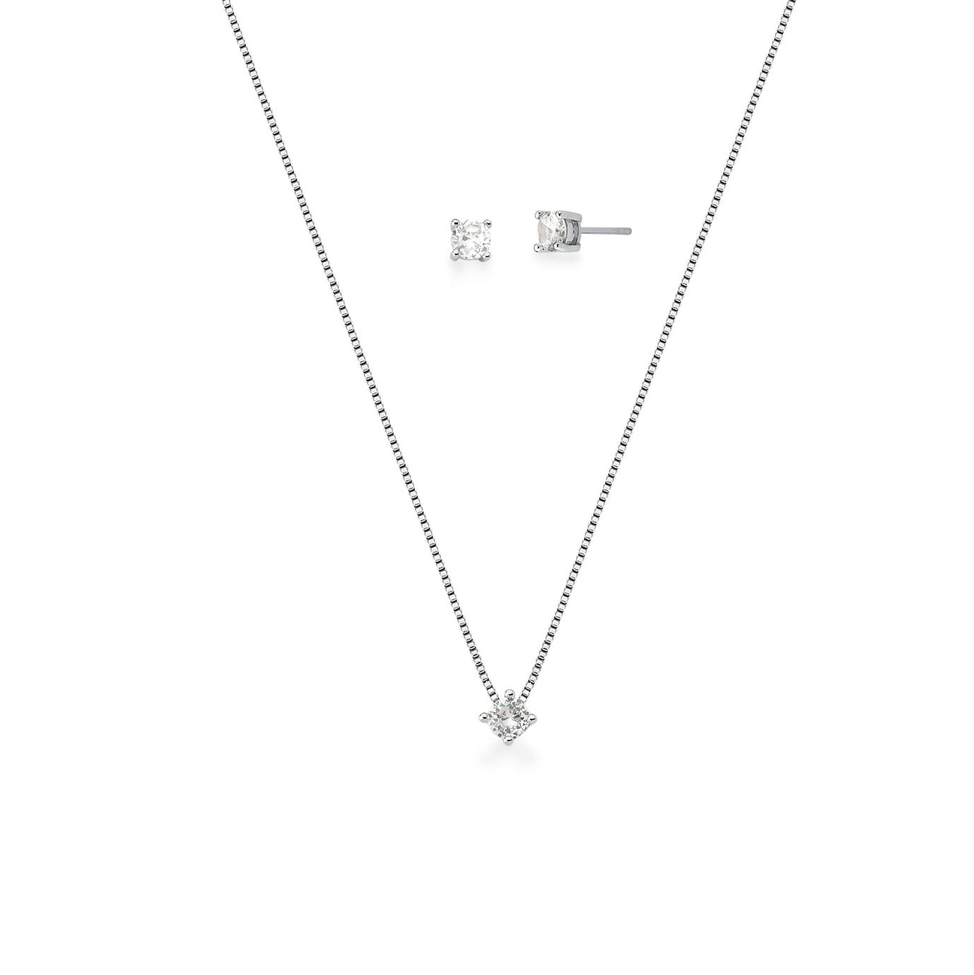 O conjunto traz a elegância atemporal do ponto de luz, composto por colar e brinco em banho de ródio com pedras redondas de 4 mm em cravação de 4 garras laterais vazadas.
