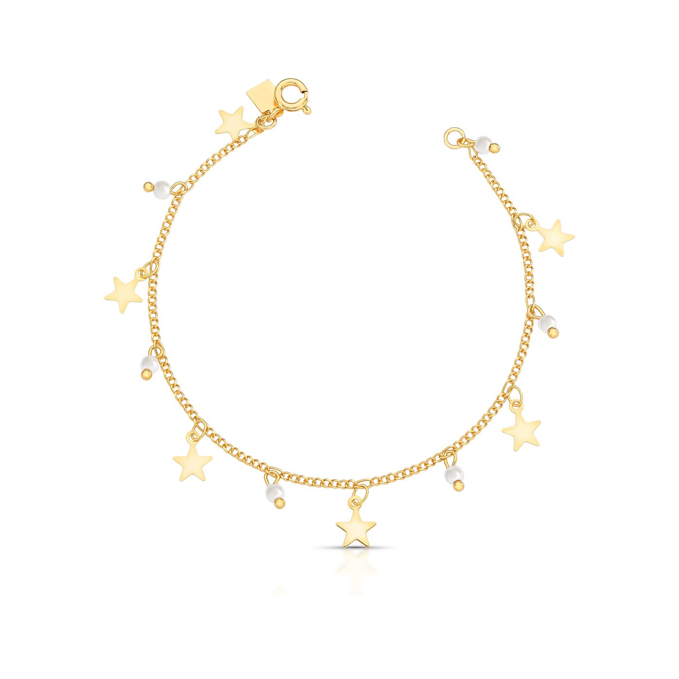 A pulseira maleável com pérolas sintéticas intercaladas ganha charme extra com pingentes em forma de estrela, que trazem movimento e delicadeza ao design. O banho em ouro garante sofisticação, enquanto o tamanho de 18 cm oferece ajuste perfeito ao pulso.